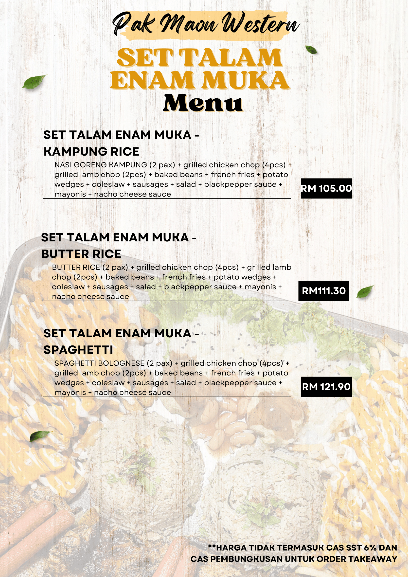BUTTER RICE (2 pax) + grilled chicken chop (4pcs) + grilled lamb chop (2pcs) + baked beans + french fries + potato wedges + coleslaw + sausages + salad + blackpepper sauce + mayonis + nacho cheese sauce